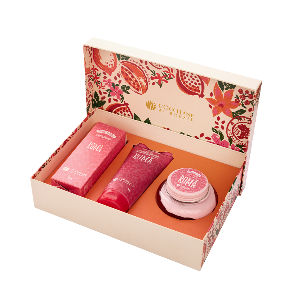 Esta composição contém Geleia Esfoliante Romã, Spray Perfumado Romã, Geleia Hidratante Desodorante Corporal Romã e Caixa Presenteável. Inspirada nos doces de compotas brasileiros, essa linha traz para sua rotina um vibrante acorde de frutas vermelhas, delicadamente envolvido por um corpo floral com notas de muget e e gerânio, envelopado por um fundo amadeirado e âmbar.